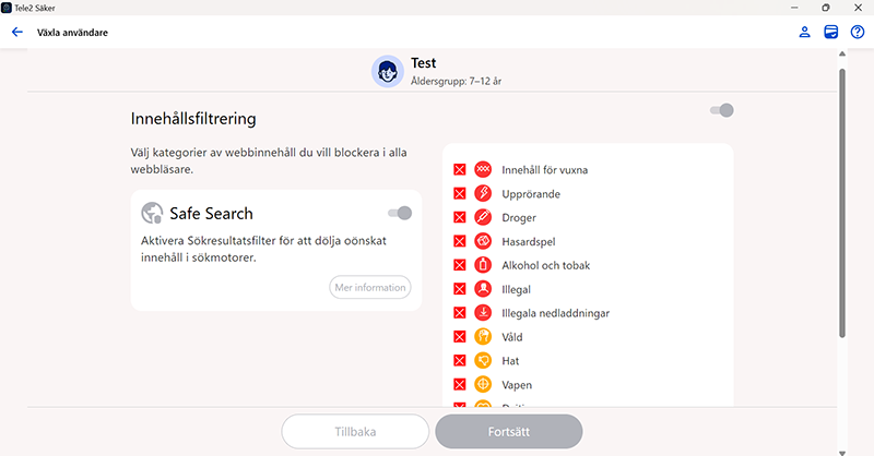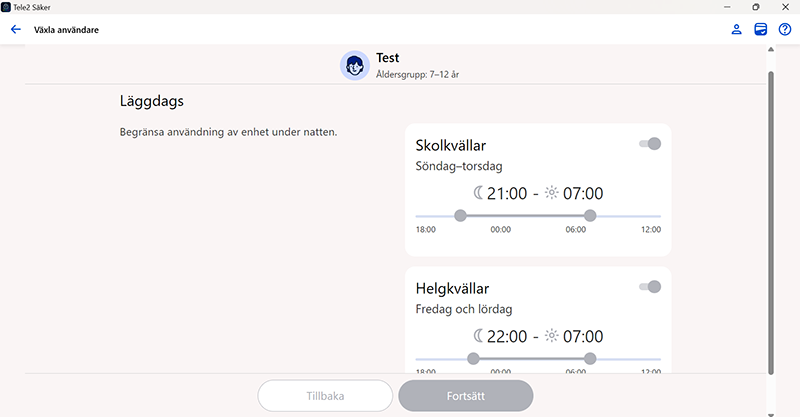Samtliga enheter med Tele2 Säker-appen bör ha sin egen profil. När du installerar appen på ett barns enhet ska du tilldela en barnprofil för enheten. Först då kan du använda Familjeregler för att begränsa barnets enhetsanvändning.